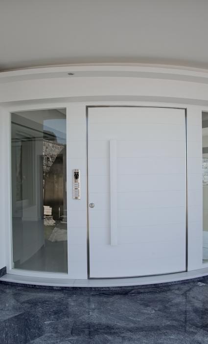 #-06-PIVOT-06 - Usa pivotanta deschidere pe ax clasa 3 securizare antiefractie cu 2 partitii puisori de geam tip termopan finisaj exterior usa Corian alb si bara din Corian iluminata cu banda